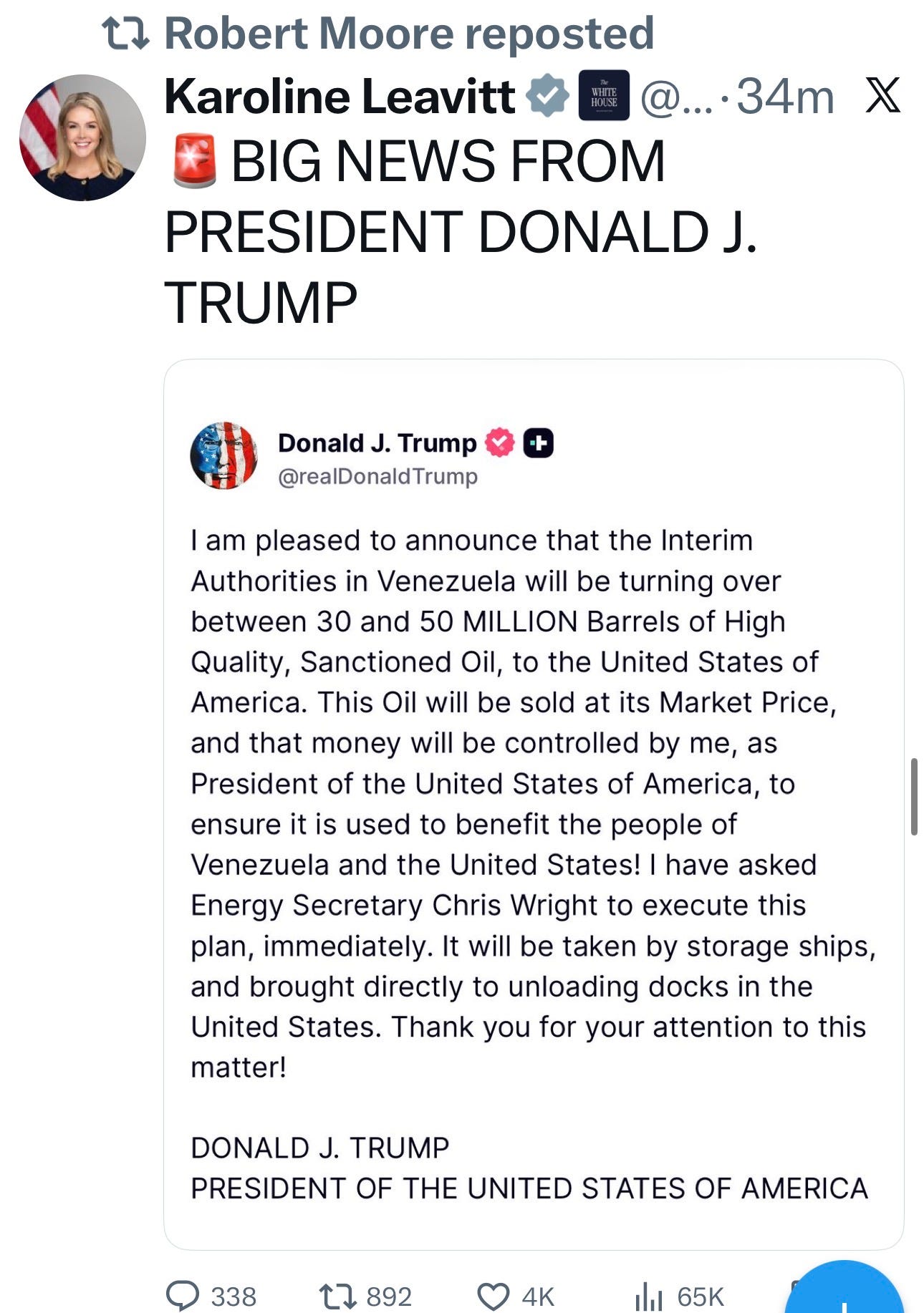 Those arenāt assumptions. Those are Trumpās words. Rubioās words. Press conferences. Press gaggles. True Social rants about Venezuela āsendingā tens of millions of barrels of oil directly to the United States, unloaded at American docks, handled personally by the president. No congressional briefing. No legal framework. No attempt at plausible deniability.