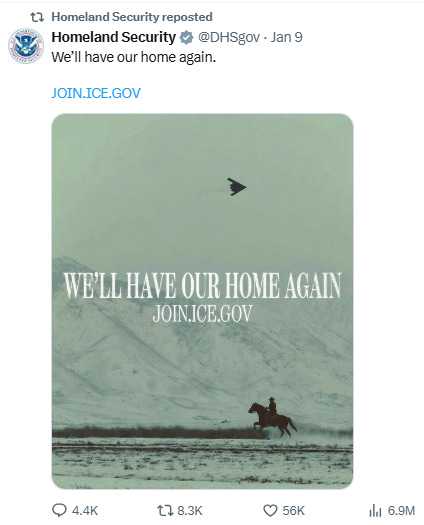 Over the weekend and in the wake of the murder of Renee Good the MAGA masks came off: official U.S. government accounts promoted recruitment imagery declaring, “We’ll have our home again.”